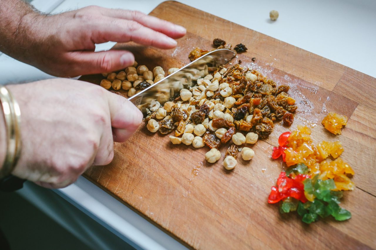 Nasekáme ořechy, kandované ovoce a rozinky na menší kousky. Ořechy opražíme.