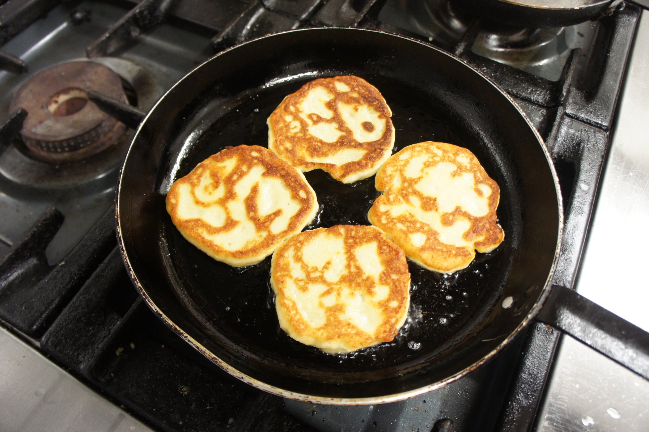 Navlhčíme si ruku a z těsta vytvarujeme placky, které opékáme na rozpálené pánvi na oleji z každé strany přibližně dvě minuty.