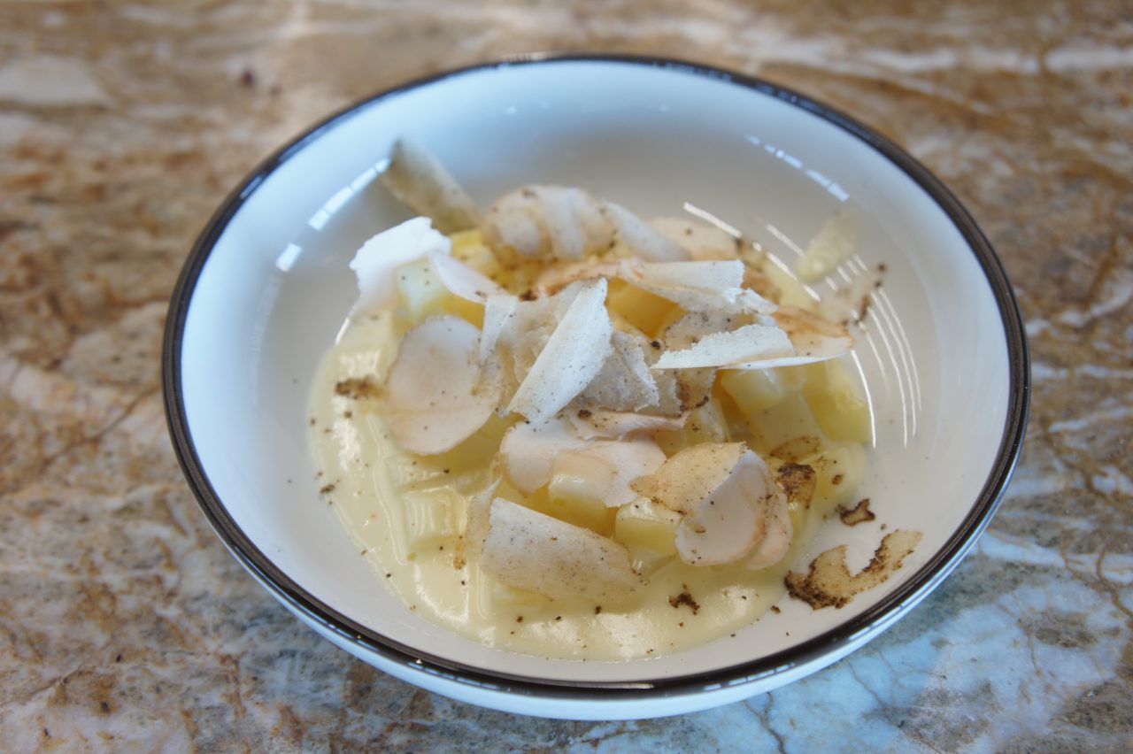 Na závěr dochutíme nastrouhaným parmazánem, máslem a crème fraîche, který nám spojí chuť brambor a cibule.