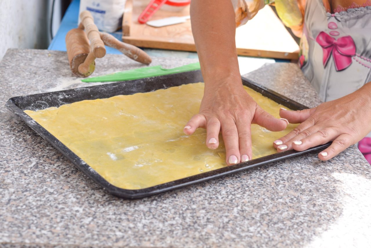 Těsto po vyjmutí z lednice dáme na pomoučený vál a rozválíme na placku silnou asi 3 mm. Tu přeneseme na plech, který dáme na 7 minut do trouby vyhřáté na 250 °C. Poté přepneme na teplotu 150 °C a dopečeme do světle zlaté barvy. Těsto musí být „naskočené“.