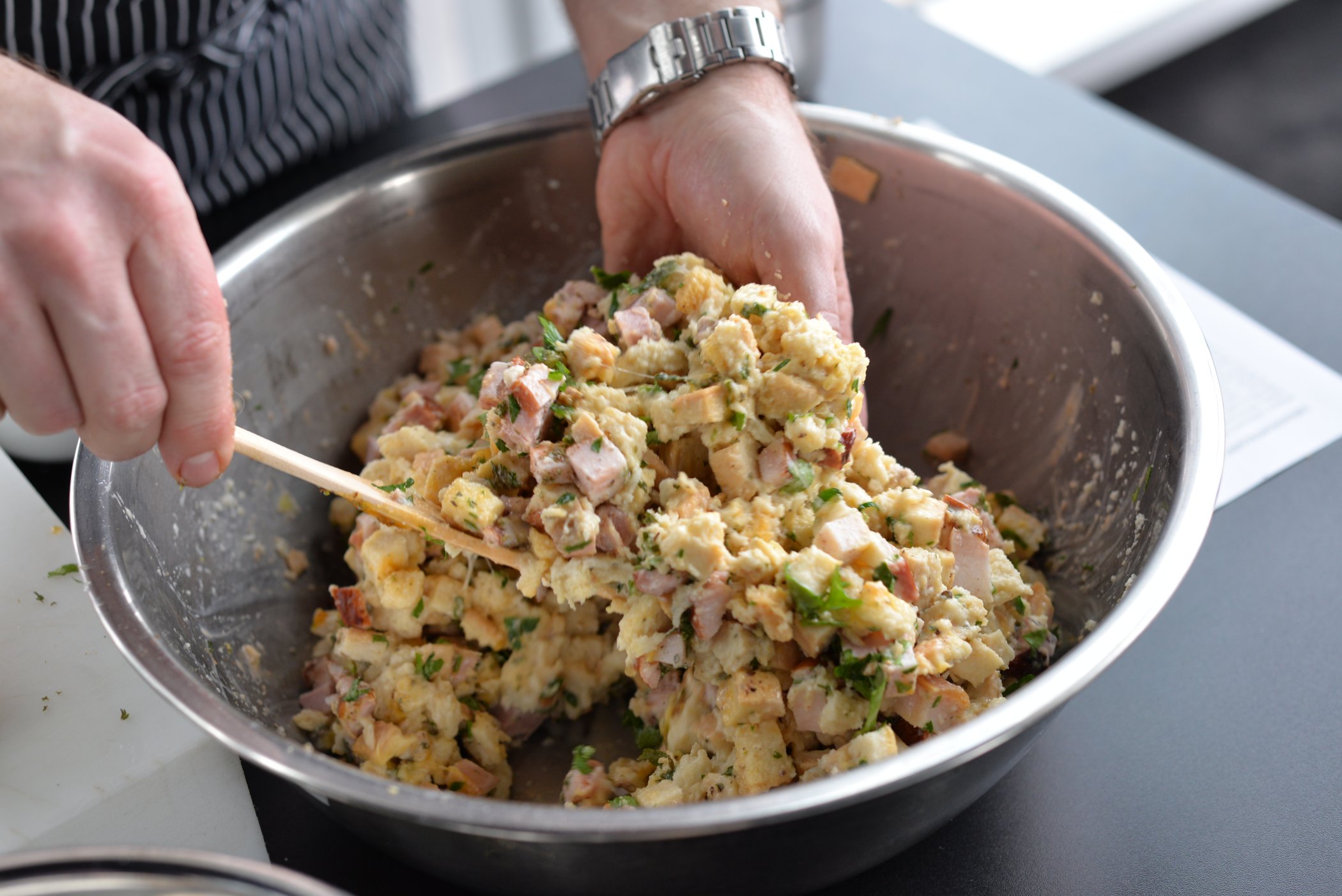 - Přidáme uzené a bylinky a opatrně rukou prohazujeme a obracíme obsah v míse, aby se mléko nasáklo do rohlíků.